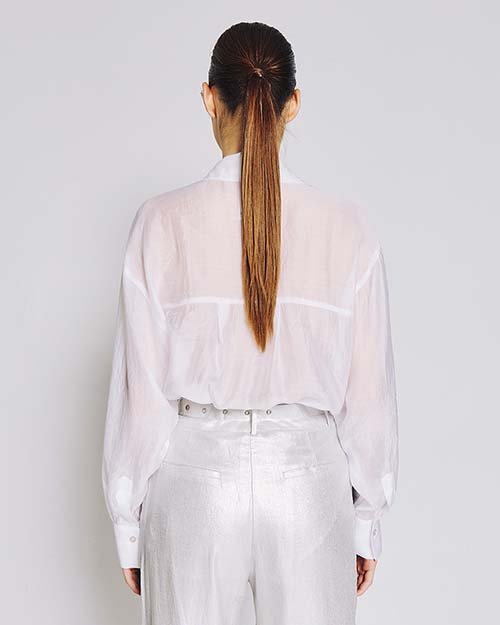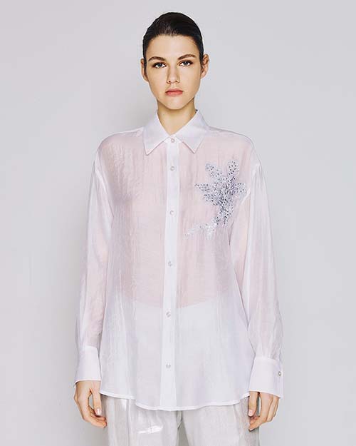 Camisa semitransparente con un delicado diseño floral bordado con lentejuelas. Cuenta con cuello clásico y cierre de botones en la parte delantera y en los puños.