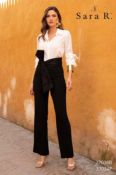 Conjunto de pantalón negro de tiro alto con lazada en la cintura, combinado con blusa blanca de manga francesa.