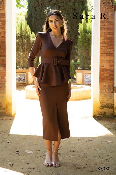 Conjunto de evento formado por cuerpo y falda, acompañado de cinturón confeccionado en el mismo tejido para un acabado armónico.