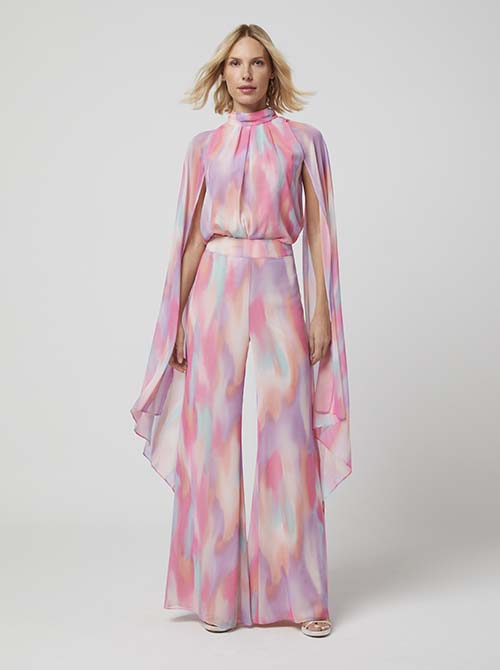 Conjunto compuesto por un top de cuello halter drapeado, de corte suelto y con velos que caen elegantemente desde la parte posterior del cuello. El pantalón palazzo incorpora una cinturilla definida y cierre lateral con cremallera invisible.
