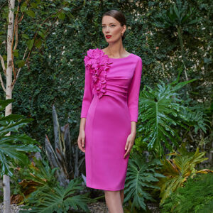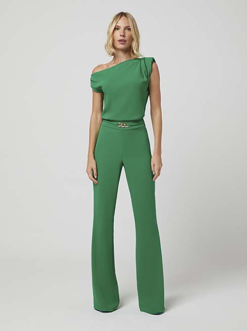 Mono asimétrico de un solo hombro y detalle fruncido, se ajusta a la cintura con un cinturón con hebilla dorada. Pantalón de pierna amplia.