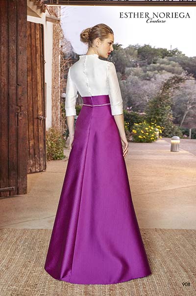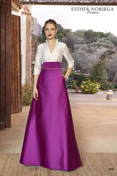 Vestido que combina un cuerpo en tono blanco con escote en V y mangas francesas, y una falda en fucsia con corte en A y cinturilla a contraste.