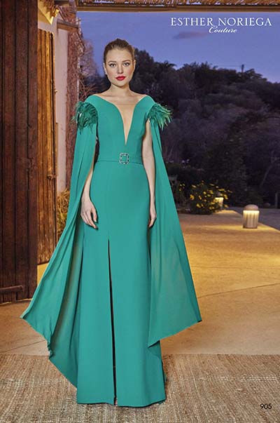 Vestido en tono verde esmeralda, con escote profundo en V, cinturón con hebilla forrada y detalles de plumas en los hombros. Capa integrada que cae desde los hombros hasta el suelo y abertura frontal y la espalda en V con botón.