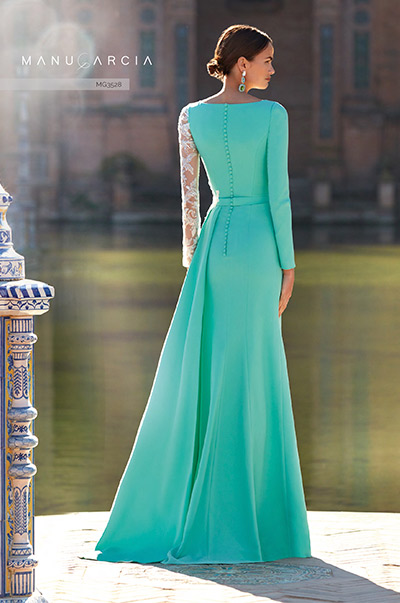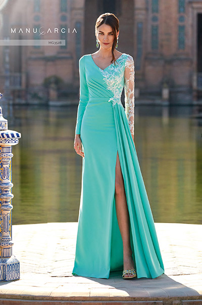 Deslumbra en el evento más especial con la magia incomparable de este encantador vestido. El romántico diseño, confeccionado en suave crepe, abraza delicadamente la silueta femenina. El cuerpo exhibe un innovador escote en pico, drapeado de manera asimétrica, y cuenta con encaje de pedrería que adorna el lado opuesto hasta la cintura. Complementando este espectacular cuerpo, la falda estilo sirena presenta una generosa abertura lateral y una elegante cascada de pliegues en el costado. Este traje es, sin duda, la elección perfecta para cualquier celebración.