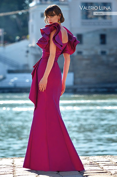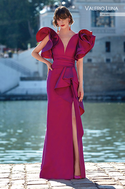 Este ligero vestido de fiesta se distingue por su corte recto, asegurando una comodidad absoluta, y su sofisticado escote en V que aporta elegancia. El tejido de jacquard añade un toque especial, mientras que las originales mangas cortas con forma de volantes destacan su estilo único. La falda cae con gracia, delineando la figura, y presenta una sutil abertura lateral que revela de manera delicada la pierna, adornada con una cascada de volantes.