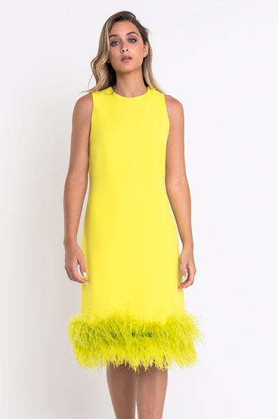 Vestido de crepé con escote estilo nadador y detalle de plumas en el bajo, ofreciendo un color que exuda alegría y un estilo único. Su diseño garantiza comodidad, despidiéndose de la necesidad de vestir ajustado para lucir elegante. Incluye una espalda cerrada con cremallera oculta.
