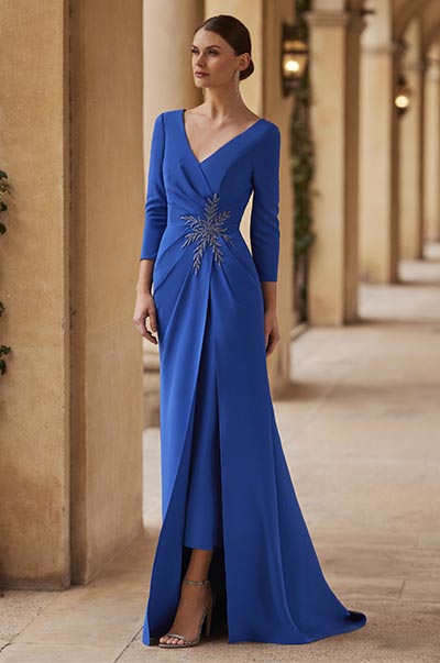 Vestido largo para invitada con un diseño moderno, elaborado en crepé y realzado con detalles de pedrería. Destaca por su escote en pico y mangas francesas. Forma parte del distinguido Look Couture Club.