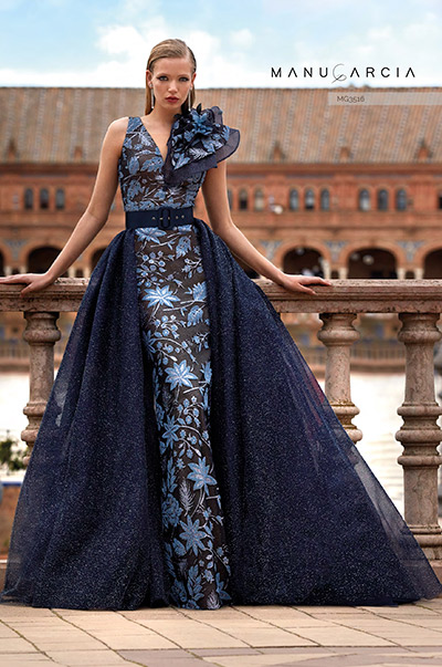Elegante vestido estampado en azul con sobrefalda desmontable. La fusión perfecta entre estilo y versatilidad, ideal para ocasiones especiales. ¡Destaca con este diseño exclusivo!