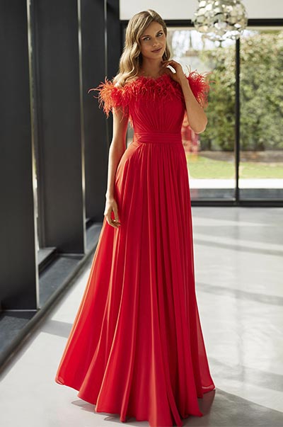 Elegante vestido largo, confeccionado en georgette y complementado con plumas. Destaca por un sugerente escote bajo los hombros.