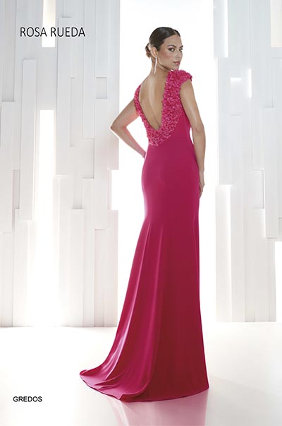 Vestido largo y entallado de corte elegante, confeccionado en tejido liso con caída fluida. Presenta un escote cuadrado y hombros decorados con aplicaciones florales o volumétricas que aportan detalle y sofisticación. La falda se abre suavemente hacia el bajo, creando una silueta estilizada y femenina.