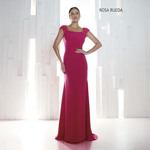 Vestido largo y entallado de corte elegante, confeccionado en tejido liso con caída fluida. Presenta un escote cuadrado y hombros decorados con aplicaciones florales o volumétricas que aportan detalle y sofisticación. La falda se abre suavemente hacia el bajo, creando una silueta estilizada y femenina.