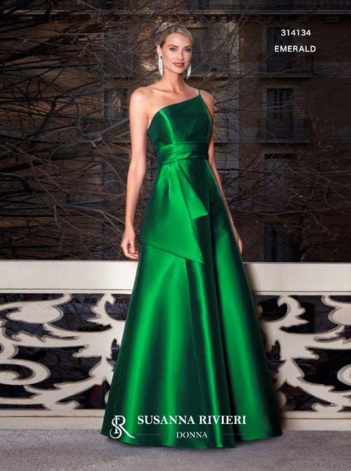 Vestido Largo color verde esmeralda, con diseño asimétrico de un solo hombro, falda de vuelo y un sofisticado lazo drapeado en la cintura que realza la figura.