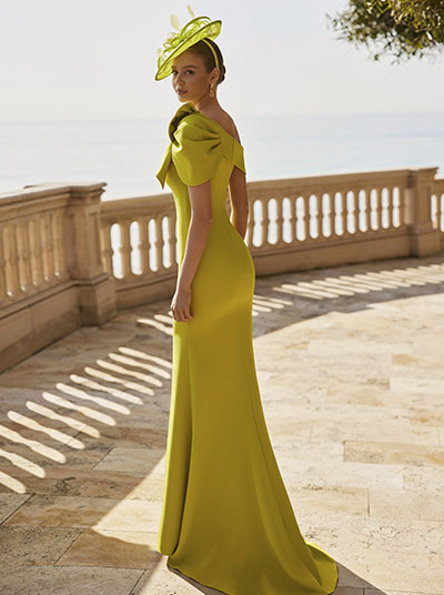 Vestido de fiesta largo, confeccionado en crepé para un acabado sofisticado. Su diseño destaca por un escote asimétrico adornado con un lazo que aporta un toque distintivo. La falda incorpora una abertura lateral, añadiendo movimiento y un aire de sensualidad al conjunto.