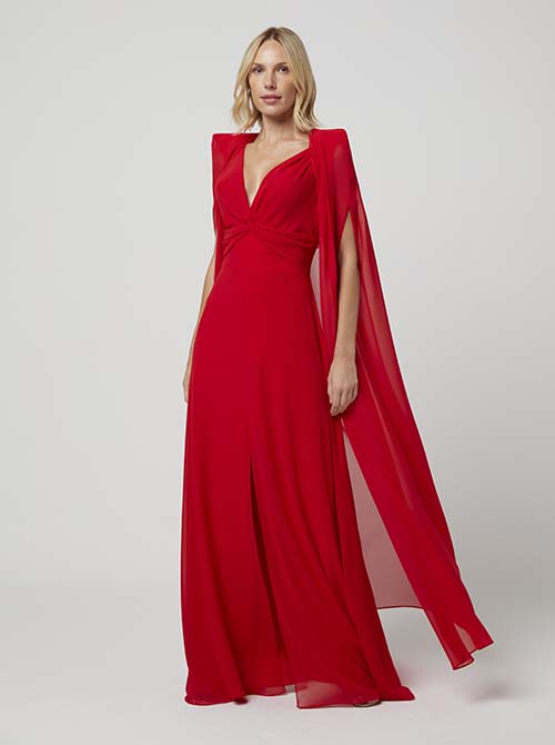 Vestido largo con capa confeccionado en gasa ligera. Presenta un escote en V cruzado, cinturilla fruncida que se anuda en la espalda y una elegante abertura frontal. La prenda se completa con una capa larga de gasa que aporta movimiento.