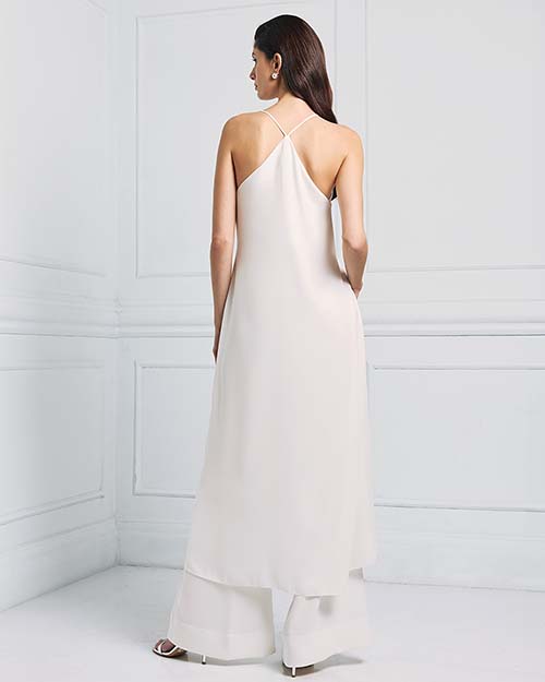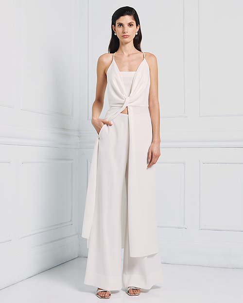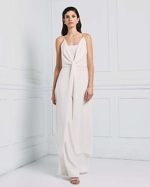 Vestido largo con escote en V profundo y detalle de nudo en la parte delantera. Incluye una sobreprenda desmontable con cremallera en la espalda
