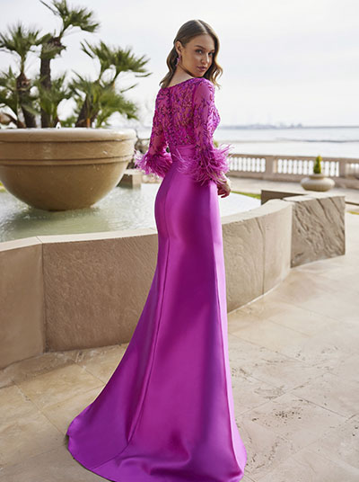 Vestido largo, confeccionado en mikado con delicados detalles de encaje. Presenta escote barco que resalta la silueta, espalda adornada con botones y mangas francesas decoradas con plumas, añadiendo un toque de glamour. La falda, con una sutil abertura lateral, aporta movimiento y distinción.