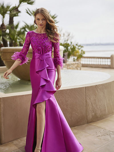 Vestido largo, confeccionado en mikado con delicados detalles de encaje. Presenta escote barco que resalta la silueta, espalda adornada con botones y mangas francesas decoradas con plumas, añadiendo un toque de glamour. La falda, con una sutil abertura lateral, aporta movimiento y distinción.