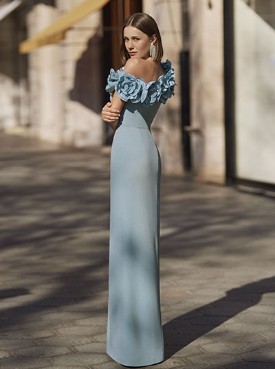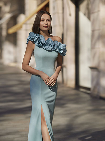 Vestido largo confeccionado en crepé elástico, se adapta delicadamente a la silueta. Su escote asimétrico aporta un toque moderno y distinguido, mientras que una sutil abertura lateral añade movimiento y sensualidad.