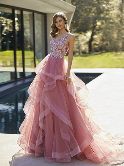 Vestido largo con un estilo romántico confeccionado en delicado tul con exquisitos detalles de encaje y pedrería. Presenta un elegante escote en V que realza la figura. Su espalda cerrada aporta un toque de refinamiento, convirtiéndolo en una opción ideal para ocasiones especiales.