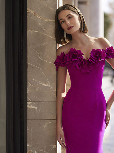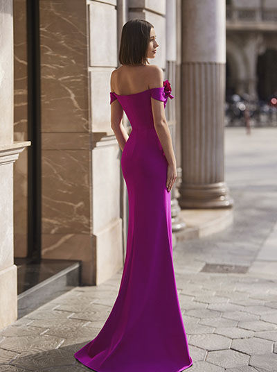 Vestido largo con un aire romántico. Confeccionado en crepé, presenta un elegante escote pico, bajo hombros que realza la silueta con delicadeza y sofisticación.