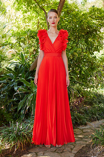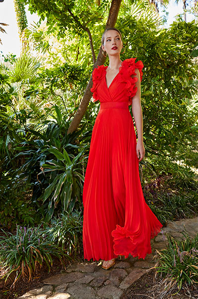 Deslumbrante vestido rojo que presenta escote en forma de V, complementado con una espalda descubierta que aporta un toque de sensualidad. Los tirantes adornados con volantes añaden un detalle único y femenino. La falda, plisada y con abundante vuelo, crea una silueta impresionante y llena de movimiento.