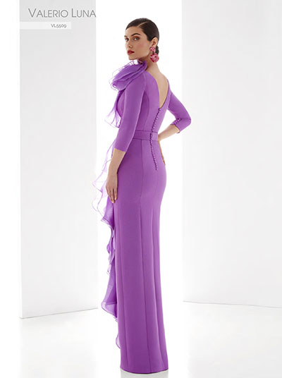 Sofisticado vestido de fiesta largo, confeccionado en suave crepé con una falda lápiz que estiliza la figura. Su elegante escote barco en el delantero se complementa con una espalda abierta en forma de V y delicadas mangas francesas. Destaca un espectacular adorno de volantes en organza al tono, que nace en el hombro en forma de flor y se extiende a lo largo del vestido. La cintura se define con un cinturón liso, dando paso a una falda con una amplia abertura que aporta movimiento y distinción.