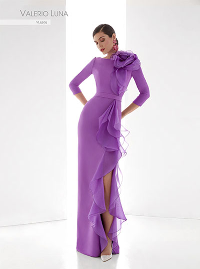 Sofisticado vestido de fiesta largo, confeccionado en suave crepé con una falda lápiz que estiliza la figura. Su elegante escote barco en el delantero se complementa con una espalda abierta en forma de V y delicadas mangas francesas. Destaca un espectacular adorno de volantes en organza al tono, que nace en el hombro en forma de flor y se extiende a lo largo del vestido. La cintura se define con un cinturón liso, dando paso a una falda con una amplia abertura que aporta movimiento y distinción.