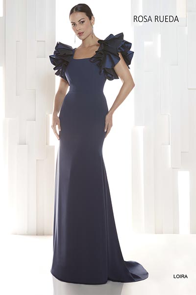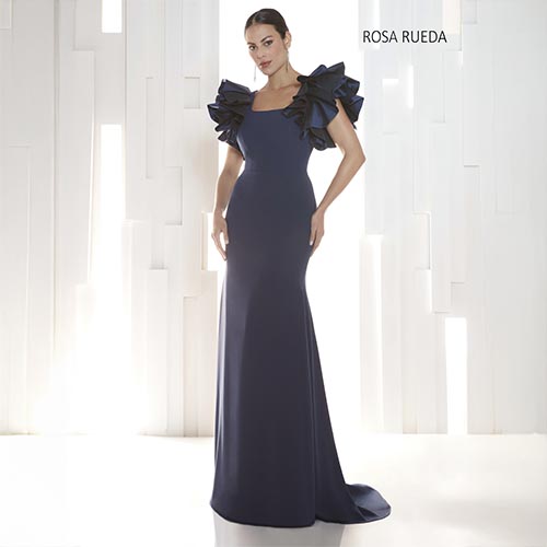 Vestido largo y entallado de tejido liso, con escote recto y hombros decorados con grandes volantes estructurados.