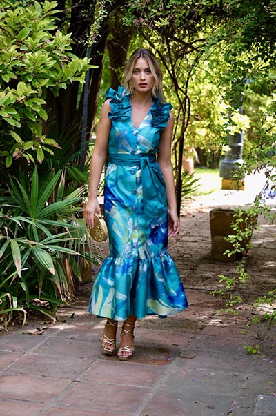 Vestido en tejido crepé con forro a juego. Su toque distintivo es el original estampado, acompañado de volantes en los hombros, una botonadura frontal y una falda con acabado en evasé.