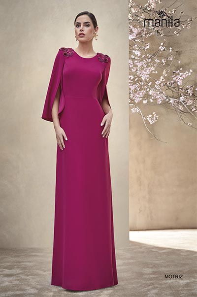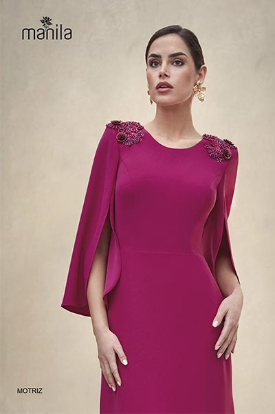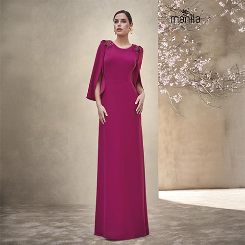 Vestido en tejido crepé de corte evasé, con hombreras pedrería y mangas cortas en forma de capa.