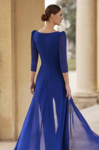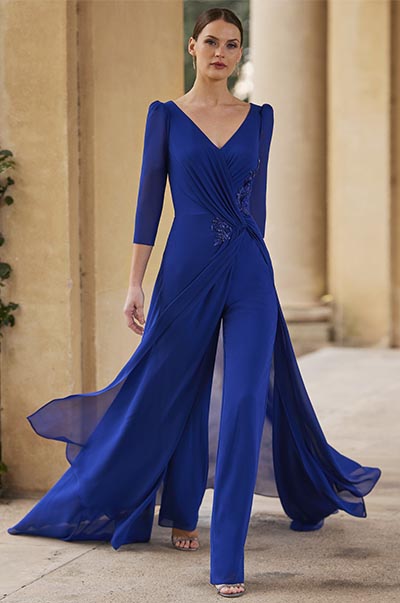 Impresionante conjunto de fiesta en formato de vestido pantalón, de color azulón, que destaca por su estilo elegante. Elaborado en georgette y enriquecido con detalles de encaje y pedrería. Presenta un sofisticado escote en V y mangas francesas. Pertenece a la exclusiva colección Couture Club.