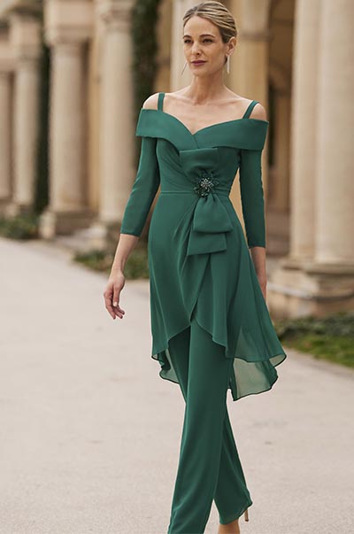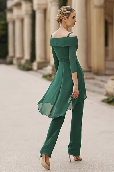 Conjunto de fiesta con formato de vestido pantalón, resplandece con un estilo moderno. Confeccionado en georgette, presenta un favorecedor escote envolvente y mangas francesas. Este look forma parte de la destacada colección Couture Club.