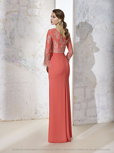 Exquisito vestido de corte sirena, fusionando lo moderno con lo clásico. La falda de creppé y georgette fluye con gracia, creando una silueta sirena que resalta tu elegancia. El cuerpo de encaje añade un toque romántico y sofisticado, mientras que las plumas en las mangas aportan un elemento de glamour audaz.