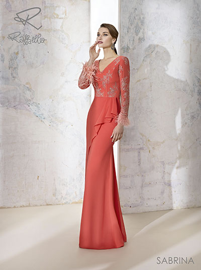 Exquisito vestido de corte sirena, fusionando lo moderno con lo clásico. La falda de creppé y georgette fluye con gracia, creando una silueta sirena que resalta tu elegancia. El cuerpo de encaje añade un toque romántico y sofisticado, mientras que las plumas en las mangas aportan un elemento de glamour audaz.