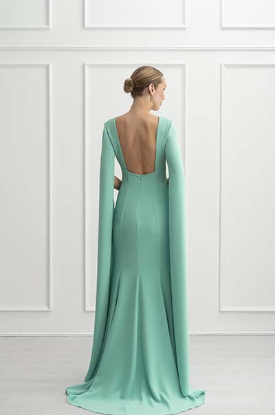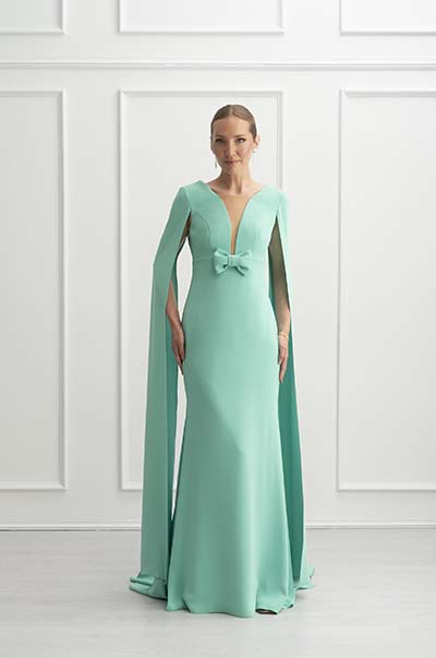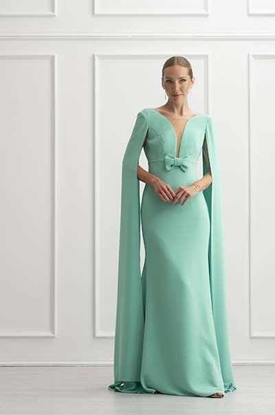 Vestido en tono verde agua con escote profundo en V, un lazo decorativo en la cintura y una elegante capa integrada que cae desde los hombros hasta el suelo y espalda abierta.